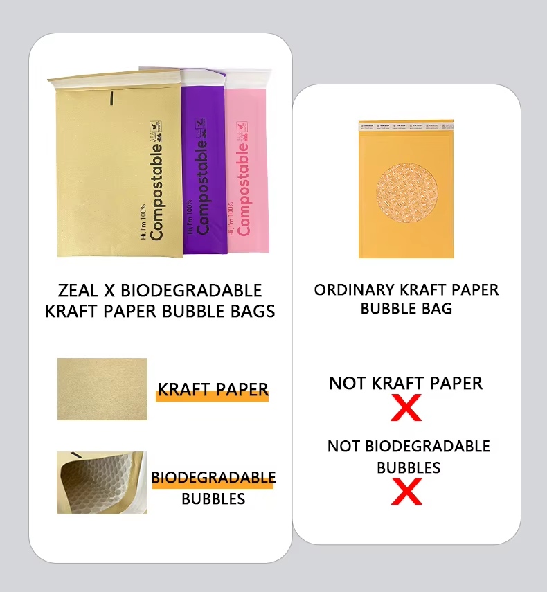 ప్రొఫెషనల్ పేపర్ బ్యాగ్ తయారీదారుగా, Zeal X కస్టమ్ సైజులు, లోగో ప్రింటింగ్ మరియు పేపర్ వెయిట్ ఆప్షన్లతో సహా పూర్తిగా అనుకూలీకరించదగిన బయోడిగ్రేడబుల్ క్రాఫ్ట్ పేపర్ బబుల్ మెయిలర్లను అందిస్తుంది. ఈ కంపోస్టబుల్ మెయిలర్లు 100% బయోడిగ్రేడబుల్, నాన్-టాక్సిక్ మరియు కాలుష్య రహితమైనవి, ఇవి స్థిరమైన ప్యాకేజింగ్ వ్యూహాలకు అనువైనవి. బలమైన టియర్ రెసిస్టెన్స్, తేలికపాటి డిజైన్ మరియు ఎక్స్ప్రెస్ డెలివరీ కోసం నమ్మదగిన రక్షణతో, మా క్రాఫ్ట్ పేపర్ బబుల్ మెయిలర్లు పర్యావరణ అనుకూలమైన, ప్లాస్టిక్ రహిత షిప్పింగ్ సొల్యూషన్ల కోసం వెతుకుతున్న గ్లోబల్ ఇ-కామర్స్ విక్రేతలచే విశ్వసించబడతాయి.