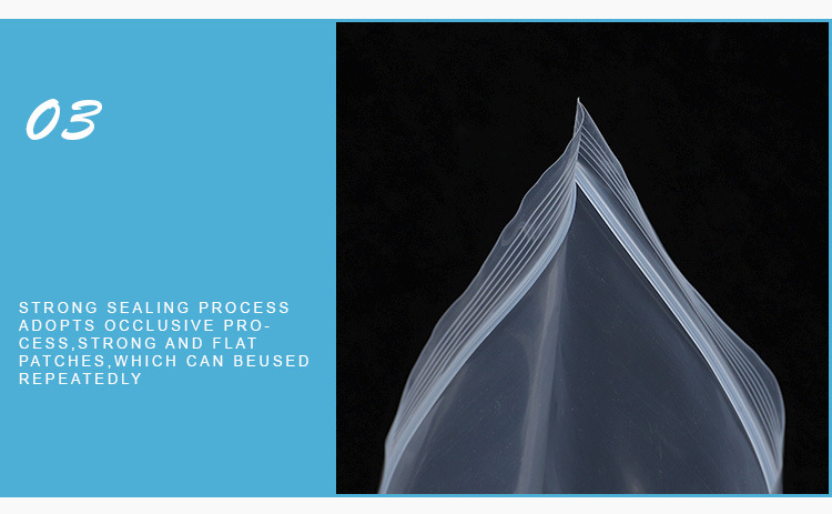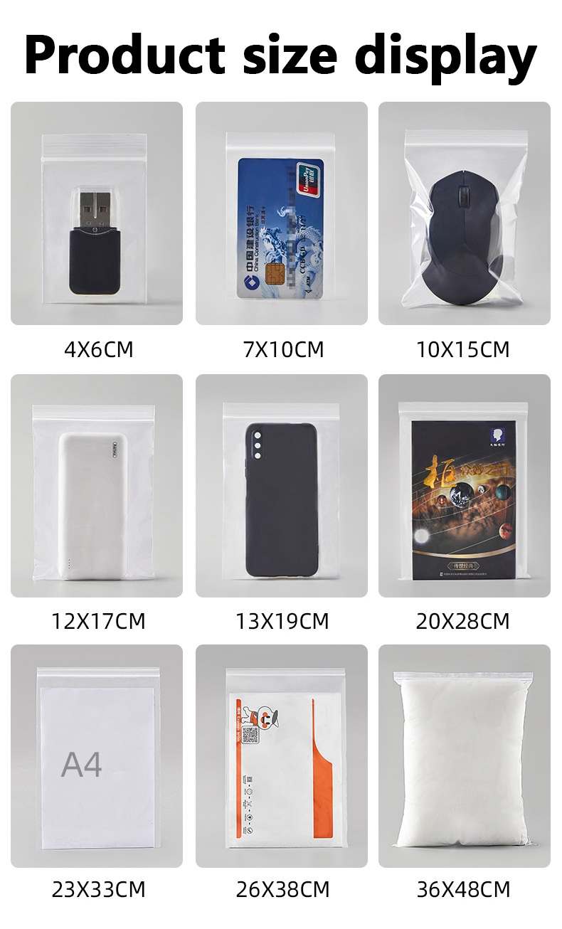 అప్లికేషన్: నిల్వ, దుస్తులు, బూట్లు, ఆభరణాలు, వైద్య, హార్డ్వేర్ ఉపకరణాలు మొదలైన వివిధ రంగాలకు, పునర్వినియోగపరచదగిన జిప్లాక్ బ్యాగ్లు వేర్వేరు పరిమాణాలు అనుకూలంగా ఉంటాయి.